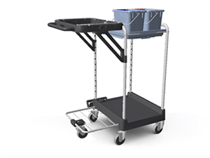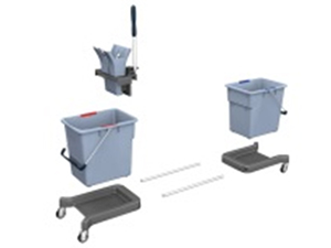 Modularna kolica za čišćenje. Dijelovi: 1 x plastično postolje, 4 x točkići, 1 x pomoćni točkić, 1 x plastični ram za kesu za smeće 120L, 1 x držač za kante, 2 x kante od 6L, 1 x metalni produžetak, 1 x rukohvat. |